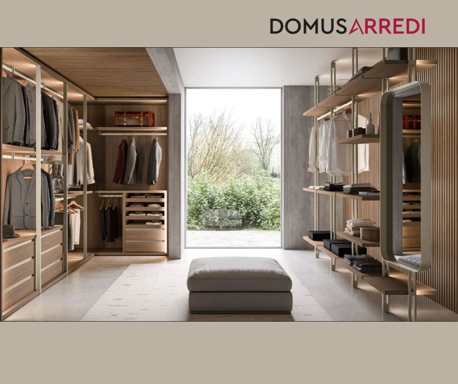 Cod.10726 - Elegante e perfettamente strutturata, questa cabina armadio unisce funzionalità e design contemporaneo grazie ai moduli “Bellavista”, che definiscono spazi ordinati per abiti, accessori e cassettiere, e ai montanti in metallo “Itala”, che donano leggerezza visiva e un raffinato carattere architettonico. Le finiture in legno caldo dialogano con le strutture metalliche creando un equilibrio tra accoglienza e modernità, mentre l’illuminazione integrata valorizza ogni comparto, trasformando l’ambiente in uno spazio organizzato, luminoso e di grande impatto estetico.