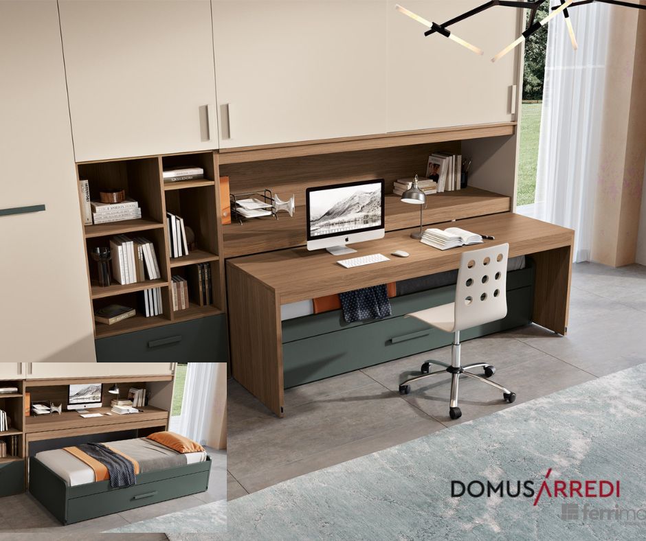 Cod.10197 - Cameretta Ferri Mobili dal design moderno e funzionale, con letto a scomparsa, ampia scrivania e vani contenitore integrati, perfetta per ottimizzare lo spazio. Soluzione elegante e pratica per ragazzi, ideale per studio e riposo in un unico ambiente armonioso.In vendita da Domus Arredi, Lissone – Via Pascoli 39, Tel. 039 794790.Preventivi personalizzati scrivendo a info@domusarredilissone.it