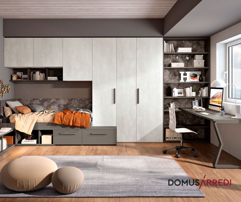 Cod.10203 - Cameretta Ferri Mobili dallo stile moderno con letto contenitore, ampia armadiatura e zona studio con libreria integrata. Le finiture neutre e i dettagli caldi creano un ambiente elegante e funzionale.In vendita da Domus Arredi, Lissone (MB), via Pascoli 39 – tel. 039 794790.Per preventivi: info@domusarredilissone.it