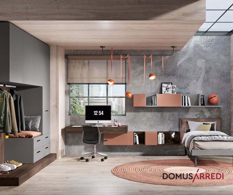 Cod.10220 - Cameretta Ferri Mobili dallo stile urbano e contemporaneo, con letto singolo, zona studio e armadiatura integrata. I colori caldi e i dettagli moderni creano un ambiente dinamico e funzionale. In vendita da Domus Arredi, Lissone (MB), via Pascoli 39 – tel. 039 794790. Per preventivi: info@domusarredilissone.it