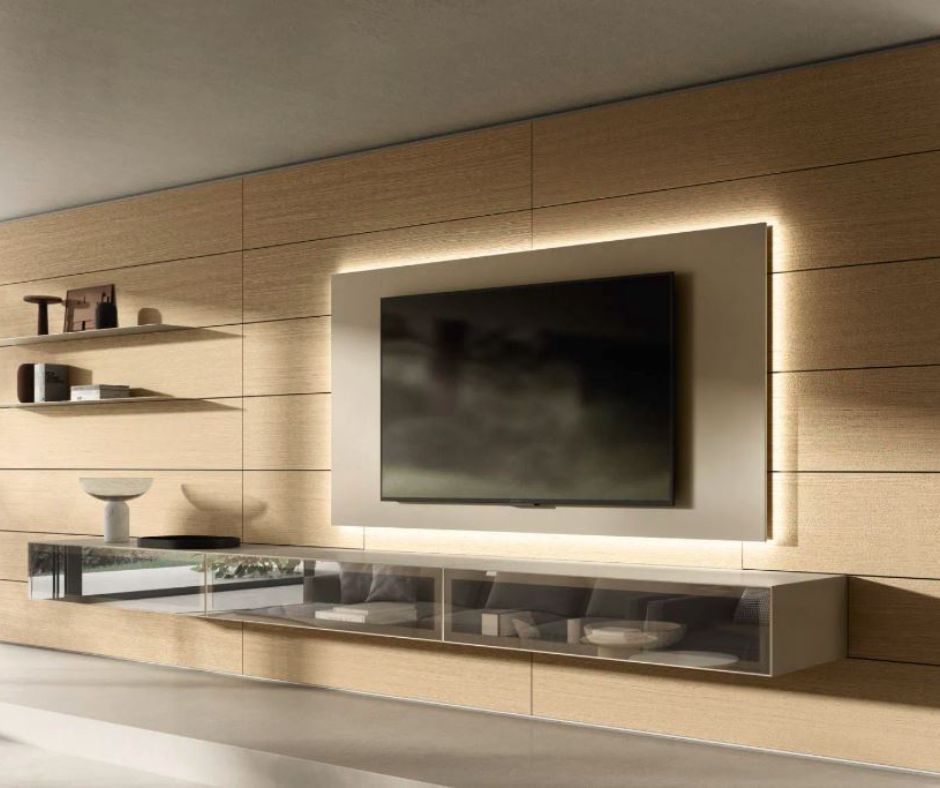 Cod.10262 - Boiserie TV Lampo di San Giacomo con LED. Parete attrezzata dal design contemporaneo ed essenziale, la boiserie TV Lampo di San Giacomo integra pannellature eleganti, mensole leggere e contenitori sospesi, valorizzati da un’illuminazione LED perimetrale che crea un raffinato effetto scenografico. Una soluzione funzionale e minimal che unisce estetica, ordine e atmosfera in un unico elemento d’arredo.