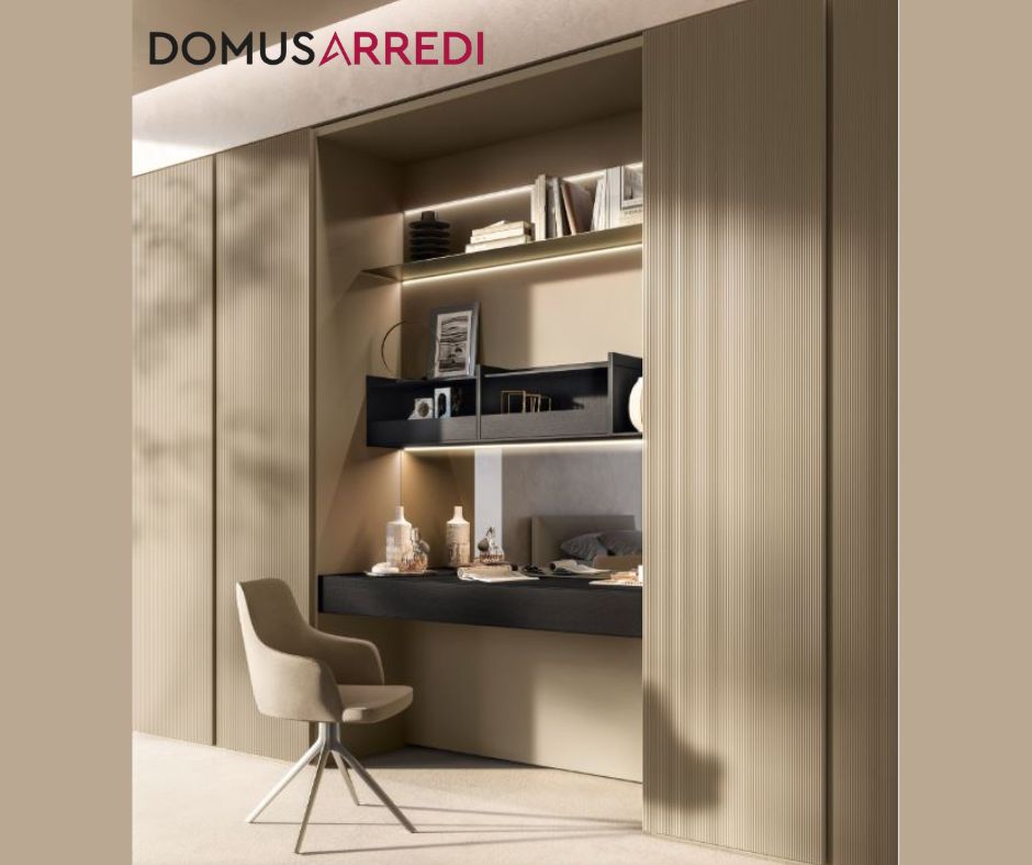 Cod.10302 - Armadio con ante a rilievo modello Trail, elegante e materico, che integra una raffinata postazione maquillage con mensole illuminate e piano dedicato. Una soluzione funzionale e scenografica che unisce contenimento e beauty corner in un unico design armonioso.