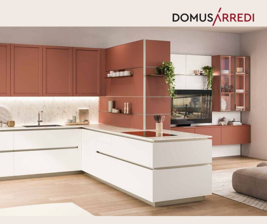 Cod.10460 - Il colore come elemento di relazione e raccordo fra cucina e living. In questa proposta vengono abbinate ante lisce laccate bianche e ante a telaio del modello Convivio. Scrivi a:info@domusarredilissone.it