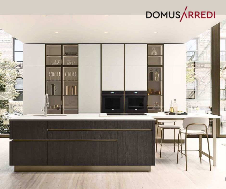 Cod.10505 - Frassino scuro per le basi e vetro opaco bianco per le colonne armadio. Un accostamento elegante, arricchito dal top in quarzo Orione. Il bancone dell'isola offre un ampio spazio di lavoro e condivisione.Per ricevere un preventino scrivi a: info@domusarredilissone.it