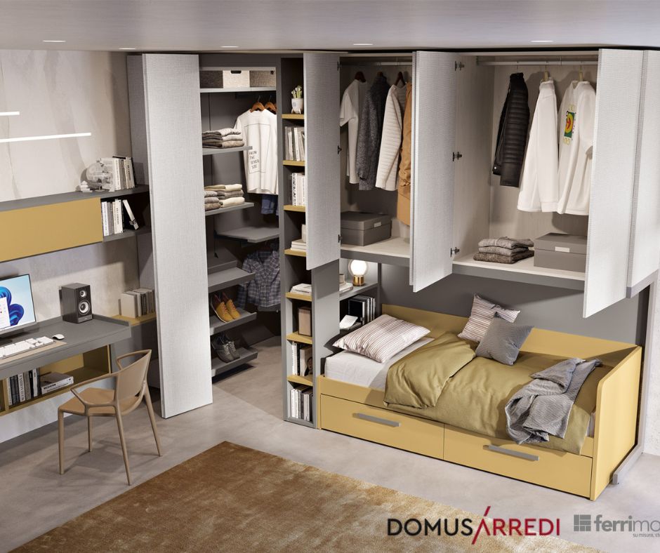 Cod.11427 - Cameretta Ferri Mobili dal design contemporaneo, con armadio angolare, libreria attrezzata e scrivania integrata. Soluzione versatile e salvaspazio, ideale per studio e relax in un ambiente ordinato e luminoso. Acquistabile da Domus Arredi, Lissone – Via Pascoli 39, tel. 039 794790. Per info e preventivi scrivete a info@domusarredilissone.it