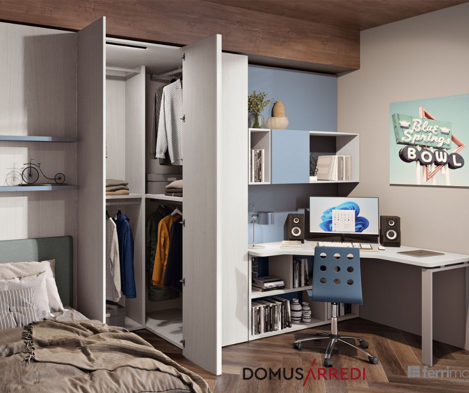 Cod.11437 - Cameretta Ferri Mobili moderna e funzionale con armadio capiente, zona studio angolare e librerie integrate. Le finiture chiare con dettagli azzurri creano un ambiente giovane e ordinato.In vendita da Domus Arredi, Lissone (MB), via Pascoli 39 – tel. 039 794790.per preventivi scrivi a info@domusarredi.it