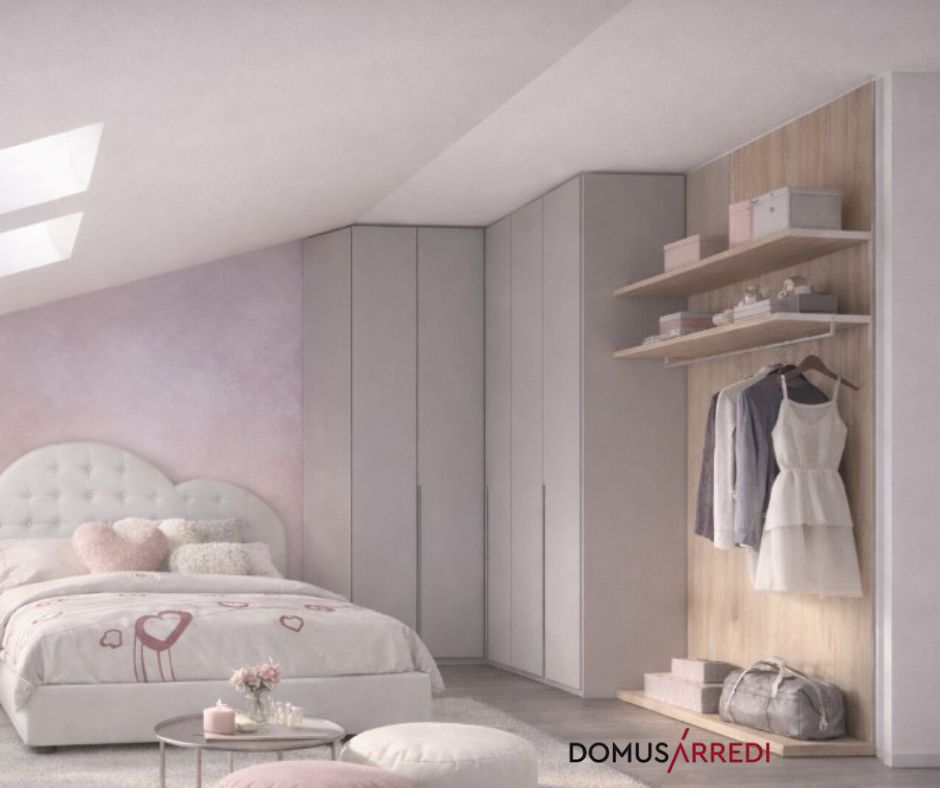 Cod.11561 - Cameretta mansardata dal design delicato e luminoso, studiata per sfruttare al meglio ogni spazio. Armadio su misura con apertura a gola che si adatta perfettamente alle falde del tetto. Letto a cuore imbottito, romantico e confortevole, ideale per un ambiente accogliente.Info e preventivi scrivendo a info@domusarredilissone.it