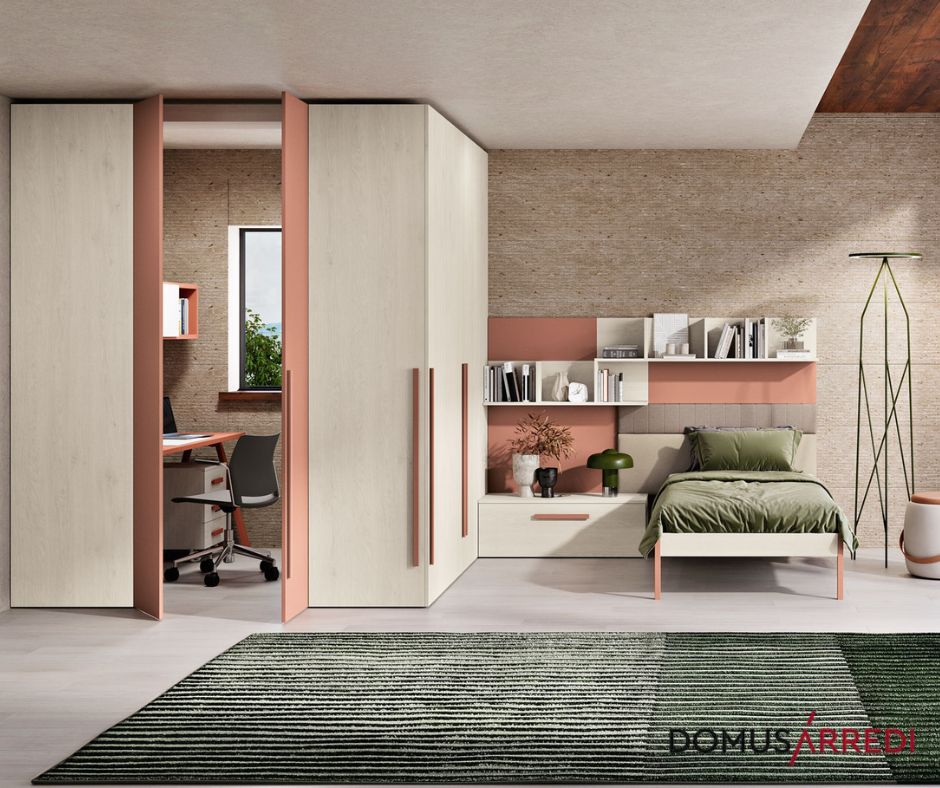 Cod.11875 - Cameretta Ferri Mobili con cabina armadio ad angolo e zona studio integrata, pensata per ottimizzare ogni spazio con eleganza. Colori tenui e dettagli moderni creano un ambiente accogliente, ordinato e funzionale. Acquistabile da Domus Arredi, Lissone – Via Pascoli 39, tel. 039 794790.