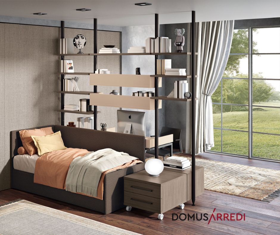 Cod.11876 - Cameretta dal design raffinato con libreria divisoria a pali, che separa gli spazi mantenendo leggerezza e luminosità. La composizione integra letto, zona studio e contenitori, creando un ambiente funzionale ed elegante. Proposta Ferri Mobili, in vendita presso Domus Arredi di Lissone, Via Pascoli 39 – Tel. 039 794790. Info e preventivi scrivendo a info@domusarredilissone.it