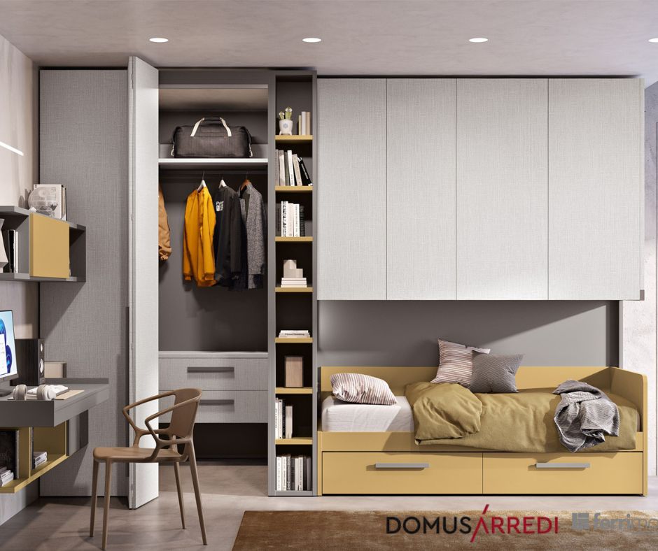 Cod.11890 - Cameretta moderna e funzionale con armadio a ponte e cabina ad angolo, progettata per sfruttare al meglio ogni spazio. La composizione integra letto, zona studio e contenitori, creando un ambiente ordinato e accogliente. Soluzione Ferri Mobili, in vendita presso Domus Arredi di Lissone, Via Pascoli 39 – Tel. 039 794790. Per un preventivo personalizzato scrivi a: info@domusarredilissone.it