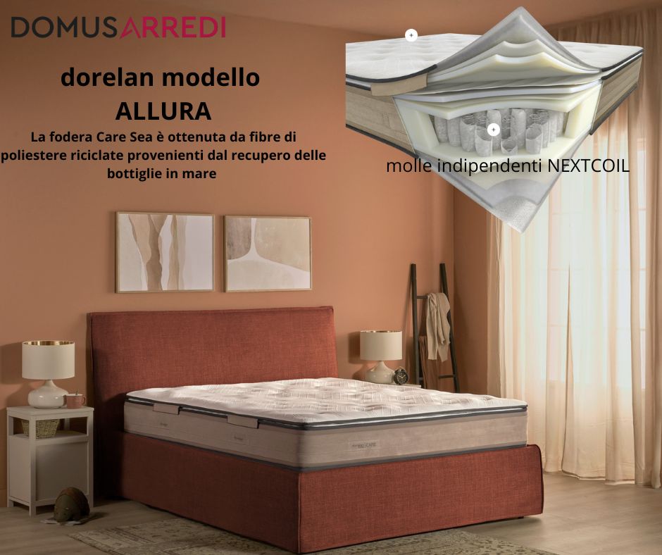 Cod.11956 - VIENI A PROVARLO IN NEGOZIOAllura racchiude una struttura a molle indipendenti NextCoil con 7 zone differenziate e uno strato interno in Myform Memory Air che lavora in sinergia con il Pillow Topper, per offrire un supporto calibrato e accoglienza più mirata.Il Pillow Topper sfoderabile combina Cotone, Ingeo e Myform Air, valorizzando il tessuto sostenibile riciclato da plastica marina e la pregiata estetica capitonné.Fibersan, a base di oli essenziali naturali, assicura protezione costante da acari e allergeni.Una soluzione equilibrata, che unisce comfort naturale, supporto calibrato e una sensazione di accoglienza autentica. TOPPER Care in Microfibre di poliestere riciclate da plastica marinaPer informazioni scrivi a info@domusarredi.it