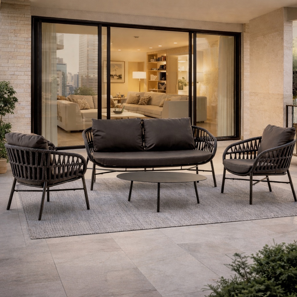 Cod.11958 - Un set composto da poltrone, divanetto due posti e tavolino, ideale per arredare dehor o loggiati con vista. Linee armoniose e materiali adatti all’esterno creano uno spazio accogliente e funzionale. Una soluzione pensata per vivere momenti di relax all’aperto, in continuità con l’appartamento.Per info scrivi a info@domusarredi.it