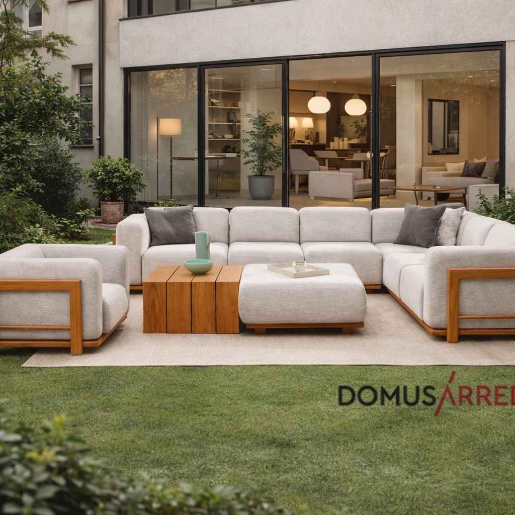 Cod.11962 - Design accogliente per serate indimenticabili all'aria aperta. Divano in teak e gomma drenante, tessuto olefin per esterni. Per info scrivi a info@domusarredi.it